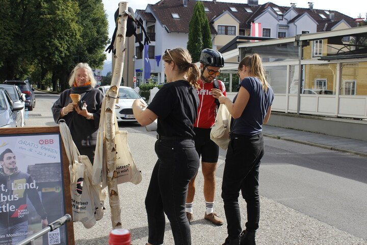 Fahrradaktion im Rahmen der Europäischen Mobilitätswoche: Die Freude war groß, als die tüchtigen Radfahrer:innen im Bereich des Tourismusverbandes Mondsee-Irrsee mitten im Markt Mondsee ein Erfrischungsgetränk und ein Goodie-Bag geschenkt bekamen - und das einfach so, "nur", weil sie radfahren ;) ! Nützliche Dinge wie ein Sattelschoner, Reflektoren, ein Apfel und ein Multitool für kleinere Fahrrad-Pannen versüßten den Vorbeikommenden den Fahrrad-Ausflug :D Das Maskottchen "EDGAR" der Europäischen Mobilitätswoche, welche jährlich zwischen 16. und 22. September 2024 stattfindet sowie ein beschilderter Mobilitätsbaum, der zu den nächsten öffentlichen Verkehrsmitteln in Mondsee zeigt, lockte die Leute herbei. An diesem sonnigen Nachmittag konnten viele tolle Gespräche mit Gästen und Einheimischen der Region geführt werden!